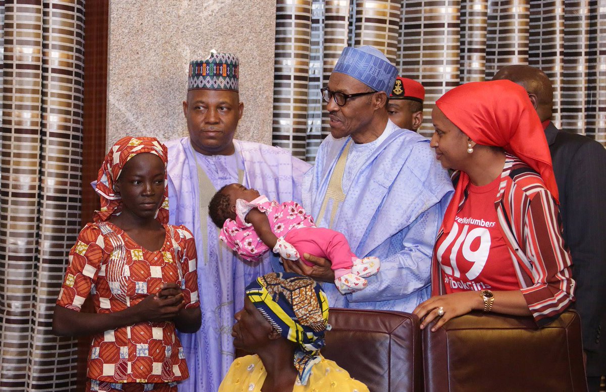 The governor and the girl, with her child were quickly taken to the president’s office by his Chief of Staff, Alhaji Abba Kyari, for a closed-door interaction with the president. NAN also reports that the girl and her baby were dressed in hijab and were shielded from newsmen by security officials. The Nigerian Army on Wednesday in a statement, confirmed the rescue of Ali-Nkeki, one of the Chibok school girls in Borno, abducted in April, 2014 by Boko Haram insurgents. The statement issued by acting spokesman of the army, Col. Sani Usman, said that the girl was among other persons rescued by troops at Baale community near Damboa in Borno.
